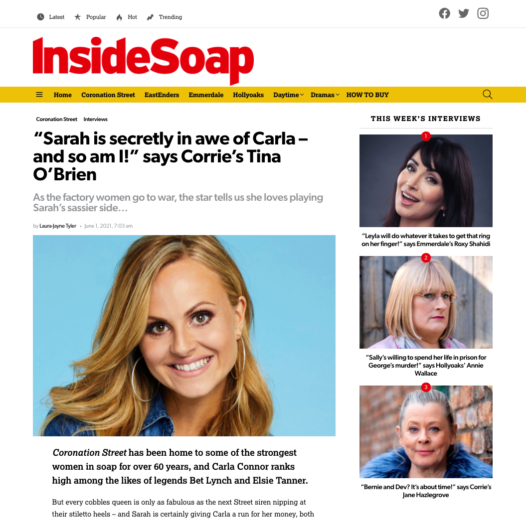 The full desktop homepage for the Inside Soap website, with one "cover story" each week, plus storyline and interview highlights.